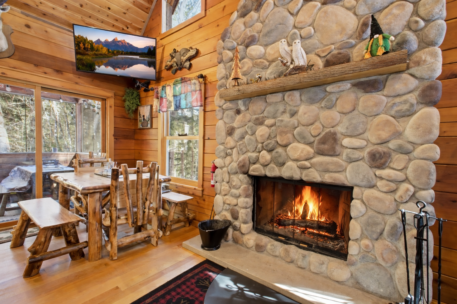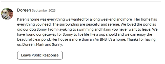 10000% recommend!!! The cabin and location was breath taking. The minute we walked in I felt comfortable and cozy. I am usually a germaphobe but I had zero complains! We even decided to stay an extra night!!! We especially loved that it was dog friendly! There were even dog bowls and toys!! Our dogs had the best time!!! Karen was very accommodating and responsive. I texted her a few times with random questions and she would respond right away. My MIL forgot her earrings at the cabin which were very special to her because they belonged to her mom. I texted Karen and she responded right away and within a few days we received them in the mail!!! Karen truly made our experience a 10/10. My family and I can’t wait to be back!